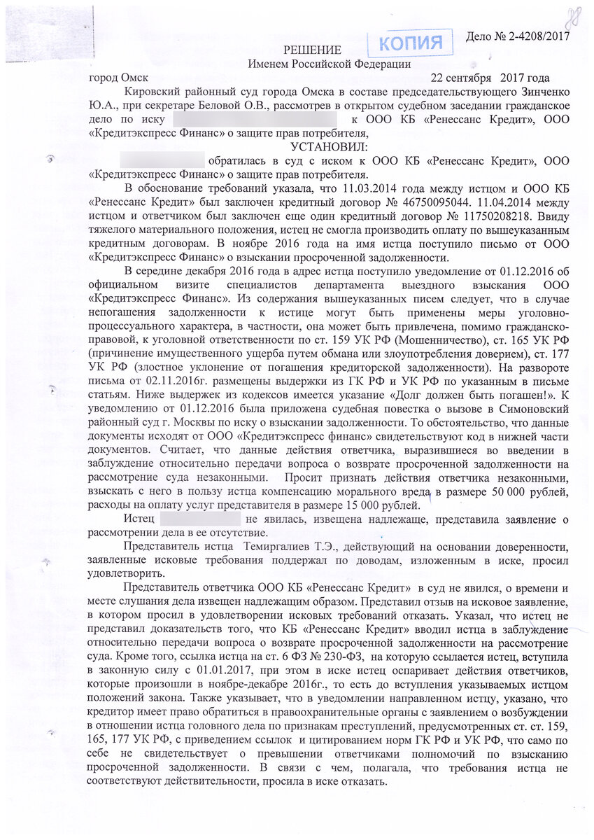 Примерно год назад мы в паблике ВКонтакте рассказывали, как с нашей помощью данная организация была наказана за попытку ввести заемщика в заблуждение. К счастью, объем просроченной задолженности, с которой работают «КЭФ», оказался значительным, а их сотрудники — необучаемыми, и потому нам пришлось столкнуться с профессиональными вымогателями взыскателями еще раз. Проблема Все прозаично: просроченный кредит, невозможность его выплачивать и ничего не гнушающиеся коллекторы. В конце-концов, заемщице обман и угрозы со стороны «КЭФ» надоели настолько, что она решила обратиться к нам. Благо, мы уже с ней сотрудничали как раз по «кредитным» вопросам. Решение Имея положительный опыт борьбы с коллекторами в ровно такой же ситуации, мы практически не сомневались в положительном исходе дела. Подготовка и подача соответствующего иска не заставили себя долго ждать. Результат По итогу рассмотрения дела мы смогли убедить судью, что «Кредитэкспресс Финанс» при взаимодействии с нашей клиенткой действ