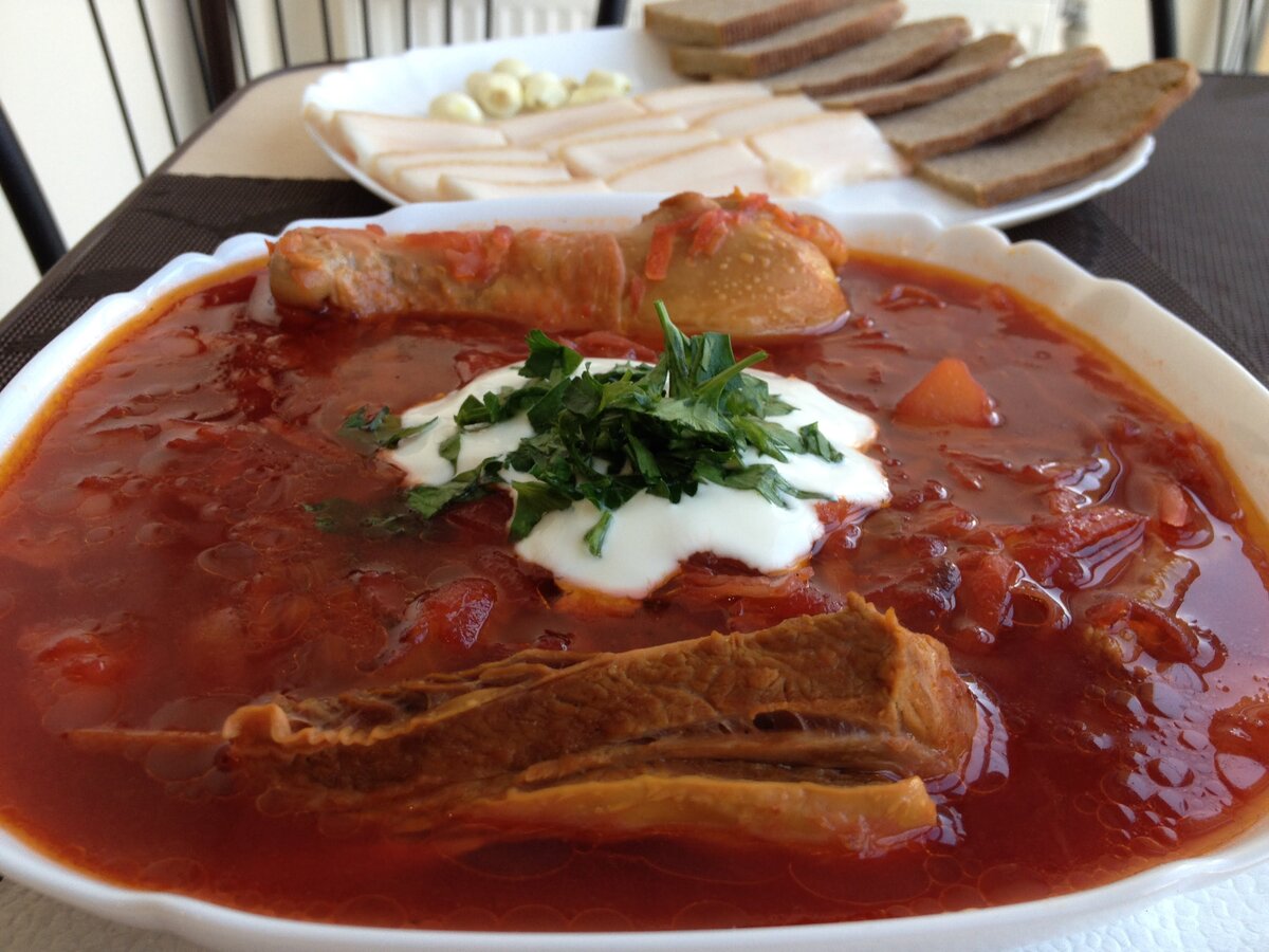 Ну, кто же откажется от вкусного и ароматного борща с салом, чесночком и чёрным хлебом. Вот такой борщ мы с вами и приготовим сегодня, чтобы порадовать всю нашу семью! Для приготовления нам понадобится · 600-700 грамм картофеля · Пучок зелени · 2 небольшие моркови · 1 средняя луковица · 2 небольших свёклы · 3 куриных голени · 400 грамм рёбрышек (телячьих) · Кетчуп Торчин для шашлыка (можно использовать любой) · Тарелочка нашинкованной капусты · Соль по вкусу · Лавровый лист и перец горошком · 0,5 ст. варёной или консервированной фасоли В пяти литровую кастрюлю наливаем примерно 2 литра воды и ставим на огонь. Когда вода закипит, закладываем рёбрышки и предварительно очищенную и перерезанную на пополам свёклу, варим 30 минут. На разогретую сковороду вливаем немного растительного масла и кладём мелко нарезанный лук, когда лучок подрумянится, всыпаем морковь натёртую на крупной тёрке и обжариваем до готовности. Перекладываем в тарелку. Достаём свёклу и закладываем к рёбрышкам куриные гол