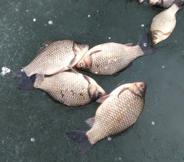 Позвали меня как то друзья мои хорошие закрывать сезон на карася. Я вроде бы как закрыл его но по окуню, но тут такое предложение, грех отказаться. И поехали мы на озеро под названием Большой Камаган. Озеро достаточно больших размеров. Подъезжая к стоянке, она там была практически одна и основная, мы увидели немалое количество машин. Разгрузив машину и переодевшись мы выдвинулись в сторону спуска. Заход на озеро был только в сапогах или в болотниках. Лёд под берегом уже растаял. До места ловли шли около километра. Придя на место мы расположились у камыша. Лунок было много, они не замерзли, так что можно даже было и не доставать бур. Я поставил две удочки около камыша. Прикормив лунки свежим жмыхом, через минут десять поклёвка и первый карасик лежал на льду. Вторая лунка пока молчала. Еще минут через пять с первой лунки достаю карасика, и тут вторая лунка ожила. Кивок просто подпрыгивал на месте. Я быстро подбежал и подсек. На том конце лески было что то крупное и не хотело