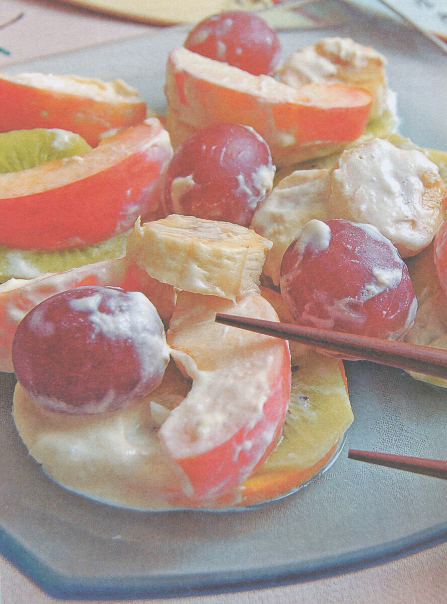 Ингредиенты: 80 гр. темного или красного винограда, 50 гр. киви, 1 апельсин, 1 яблоко, 1 банан, 60 гр. нежирного йогурта. Способ приготовления: Виноград отделить от веточек, вымыть, высушить. Аккуратно вымыть киви, высушить и нарезать тонкими ломтиками. Вымыть яблоко, удалить сердцевину и нарезать дольками. Банан вымыть, очистить, нарезать кружочками. Апельсин вымыть, нарезать кружочками. На плоское блюдо выложить кружочки апельсина, сверху положить киви, затем банан и яблоко, добавить виноград и заправить йогуртом. На заметку: По своему желанию можно добавить ягоды или орехи, тогда фруктовый салат станет намного полезнее и вкуснее.