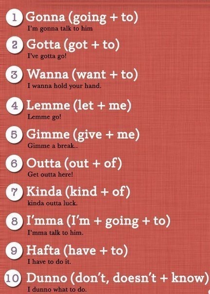 Если вы смотрите американские фильмы /сериалы / передачи или слушаете музыку, то заметили, что американский разговорный язык "напичкан" разными сокращениями. В сегодняшнем уроке самые популярные сокращения в американской речи. Они появились из-за того, что в речи слова произносятся быстро, "комкаются", да и просто говорить так удобней. Wassup (What's up?) - Как делишки?