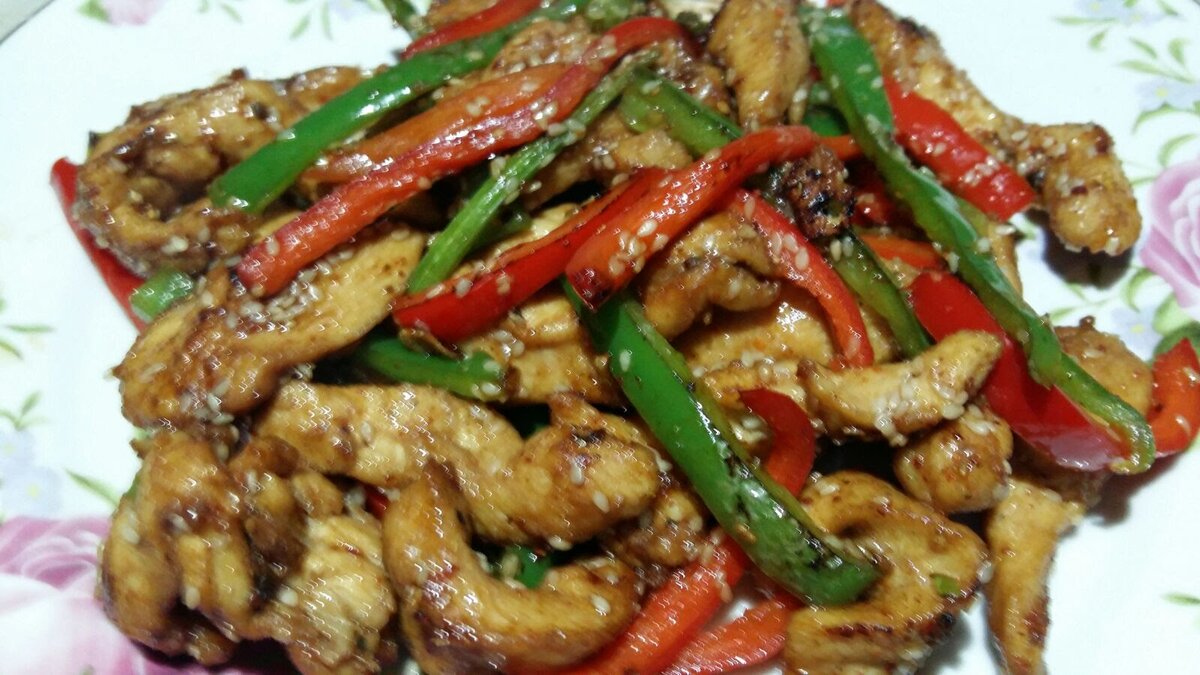 видео рецепт в конце статьи Итак весь секрет в крахмале, да, это не мука, а именно крахмал. Курицу нужно жарить в большом количестве хорошо накаленного масла идеально фритюр, грудки готовятся очень быстро. Обжарив и отложив в сторону, наливаем в сковороду небольшое количество масла, быстро обжариваем перчики кидайте и красные и зеленые и желтые, дайте вашему блюду красок, быстро обжарив не больше 3х минут