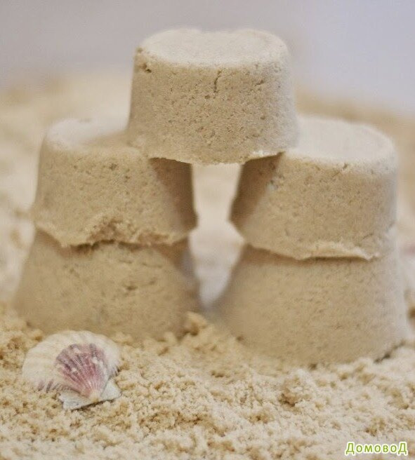 Предлагаем необычный рецепт кинетического песка своими руками в домашних условиях Многие слышали или знают что такое кинетический песок. Его прелесть и ценность в том, что он всегда поддается лепке. Он хорошо склеивает, но не прилипает к коже. Этот "живой" песок - прекрасная альтернатива обычному! Кинетический песок идеален для лепки и создания. Так как он не рассыпается как обычный, с ним можно забавляться даже дома - в тазике или за специальным столиком, а если не пугает уборка, то и на полу. Рецепт кинетического песка: Смешайте вышеуказанные ингредиенты в миске или тазике и хорошо перемешайте. Кинетический песок готов! Легко и быстро! Доставайте лопатки, пасочки, ракушки, любые другие реквизиты! Пришло время играть! Если хранить кинетический песок в закрытом контейнере в перерывах между играми, то он прослужит Вам несколько месяцев. По материалам Домовод.com