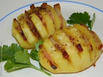 Для любителей картошки это блюдо будет подарком. Оно простое в приготовлении, на него мало идет продуктов. Но получается очень вкусно. Попробуйте! Надо: 2-3 картошки на человека Соленое или копченое сало или грудинка Чеснок Зелень Сыр Соль Перец Приправы Готовим: Хорошенько моем картошку и делаем в ней надрезы почаще до середины картошки. Картошка стала похожа немного на книжку. Чеснок раздавим ножом и зальем 50 г воды, пусть настаивается. А мы в надрезы картошки складываем то, что у нас имеется: маленькие кусочки сала или грудинки, поливаем чесночной водой, посыпаем измельченной зеленью и сыром. Ставим в разогретую духовку. Примечание: Если не любите жирное, сало можно убрать потом. Приятного аппетита!
