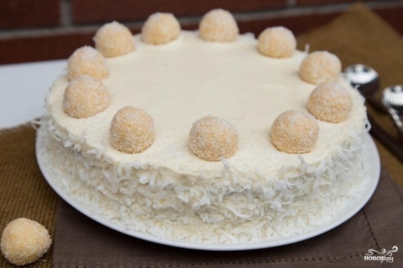 Этот торт я обожаю! Он просто бесподобен, а готовить его очень легко и просто! Нам потребуется: 1,5 ст.л. муки, 2 ст.л. сахара, 350 мл. молока, 100 гр. вареной сгущенки, 100 гр. размягченного слив. масла, 300 гр. печенья (любое), 2 ст.л. кукурузного крахмала, 100 гр. кокосовой стружки. Заливаем сахар молоком, добавляем ванилин, кукурузный крахмал и муку. Все перемешиваем и ставим на плиту. Доводим до кипения, и варим до консистенции густой сметаны, непрерывно помешивая. Снимаем с плиты, добавляем размягченное сливочное масло, и тщательно вымешиваем до однородной массы. Делим нашу готовую массу на две равные части. На плоское блюдо или форму(желательно квадратную), выкладываем нашу первую часть массы, равномерно распределяя по всему дну - это наш первый слой, затем, вторым слоем выкладываем вареную сгущенку, далее берем печенье и укладываем плотно друг к другу слегка прижимая каждую. И последний слой - вторая часть оставшейся массы. И в завершении посыпаем кокосовой стружкой вверх и