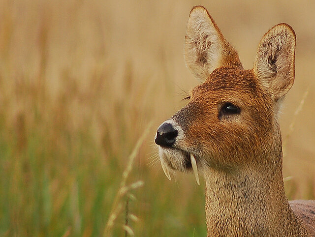 Природа обделила водяного оленя главным отличием его рода. У него нет рогов. Зато та же природа, чтобы олень мог выживать, снабдила его другим интересным оружием.