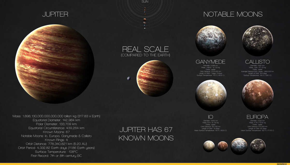 Всем привет, в этой статье вы прочитаете о одной из самых интересных и больших планет в солнечной системе, о фактах связанных с газовым гигантом, "поехали". Юпитер имеет 63 спутника. 4 массивных спутника: Ио, Европа, Ганимед и Каллисто, названых «галилеевыми» спутниками, были открыты в 1610 году Галилео Галилеем. Ганимед является самым большим спутником, от края до края — 5262 км, что делает его больше, чем планета Меркурий. Еще одним интересным спутником является Ио, на котором расположены свирепые вулканы, озера лавы, так же там идут дожди из алмазов, что не может не радовать ; ). Большинство спутников Юпитера имеют в диаметре не больше 10 км. На этом гиганте происходят очень сильные ураганы. На Юпитере бури обычно долго не длятся, примерно 3–4 дня. Однако есть и исключения. Ураганы на Юпитере всегда сопровождаются молниями и гораздо сильнее, чем штормы на Земле. Сильные ураганы случаются каждые 15–17 лет, их скорость составляет 150 м/с. В 1665 г. астроном Джованни Кас