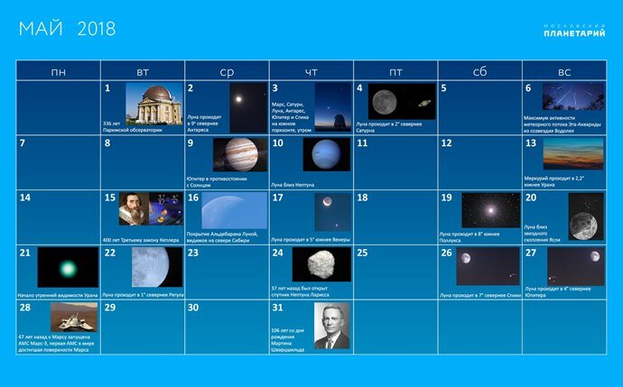 Май порадует наблюдателей майским звездным дождем – весь май месяц действует метеорный поток Эта-Аквариды или Майские Аквариды, рожденный знаменитой кометой Галлея. Пик потока – 6 мая, ожидается от 10 до 55 метеоров в час, но Луна помешает наблюдениям. 3 мая на утреннем небе (с 3 часов и до восхода Солнца), можно наблюдать 6 светил, которые выстроятся над южным горизонтом практически в одну линию – это Марс, Сатурн, Луна, Юпитер, Спика и Антарес, который будет расположен немного ниже к горизонту. 9 мая Юпитер в противостоянии с Солнцем - наступит наилучший период наблюдения Юпитера в 2018 году. Звездное небо мая На севере у горизонта расположился Персей и слева от него – Возничий. Близнецы заходят на северо-западе. На северо-востоке – Цефей и Кассиопея, а под ними вблизи горизонта – Пегас. На востоке видно созвездие Лебедя и над ним – голова Дракона. В южной части неба расположен Волопас, рядом с ним – Северная Корона и Геркулес, ниже них – Змееносец, а вблизи горизонта – Скорпион.