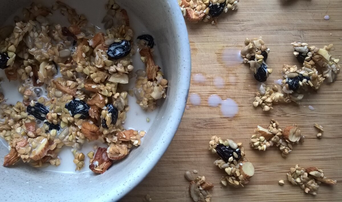 Гречнево-фисташковая гранола с финиковой карамелью и шоколадным молочком