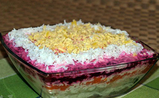 Свекла – полезнейший продукт по многим показателям! Лично у меня - пониженный гемоглобин, и я с удовольствием ее ем в разных блюдах. Но есть 4 классических блюда, которым я верна на протяжении всей своей жизни. О двух из них – борще и винегрете - я рассказала в Части 1. А сегодня я поделюсь еще с двумя рецептами - «селедки под шубой» и «пикантной закуски». 3. Итак, селедка «под шубой» - Филе сельди кусочками раскладываю на дно специальной посуды, посыпаю мелко нарезанным луком и сбрызгиваю маслом. Смазываю небольшим количеством майонеза. - Сверху натираю на терке картошку, солю и уже основательно промазываю майонезом, как и последующие слои. - А следующий слой – тертая морковка. Но я часто делаю без нее, мне так больше нравится. Поэтому мой следующий слой – тертая свекла. Некоторые хозяйки повторяют слои - от селедки до свеклы - еще 1-2 раза. Но я делаю все просто! – в один слой. - Последний – верхний слой – я покрываю тертым яйцом. Причем, тру через крупную терку – белки. Маж