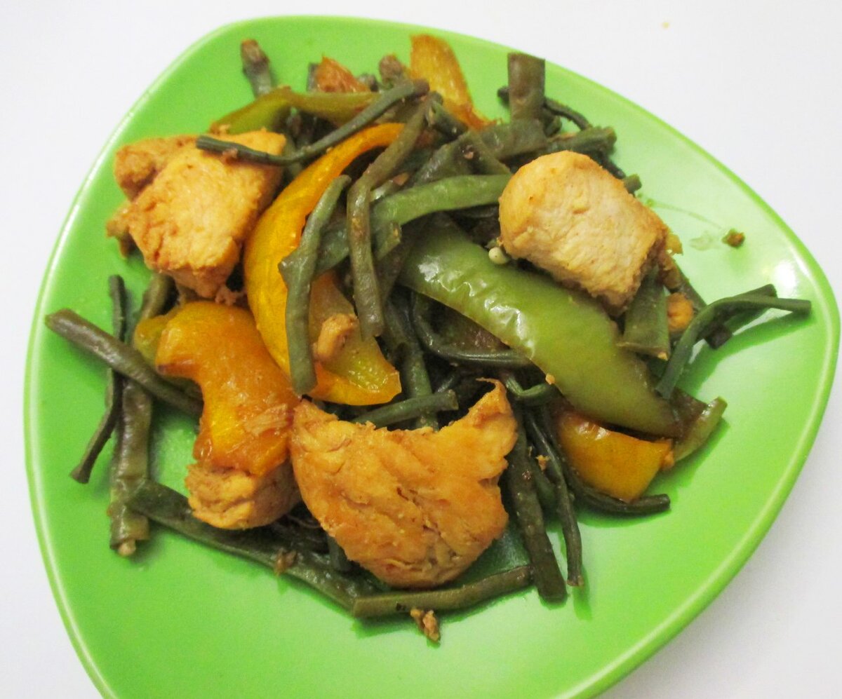 3.Болгарский перец добавляем чуть чуть воды и обжариваем пару минут, добавляем чеснок и через минуту добавляем фасоль и курицу 4.Добавим 100 мл соевого соуса и тушим пока жидкость не выпарится мин 7-10