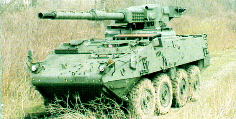 Как упоминалось, 105-мм нарезная танковая пушка серии L7/М68 остается высокоэффективным противотанковым орудием и благодаря малому откату может легко устанавливаться на многочисленные имеющиеся шасси БМП. Кроме того, германская 105-мм пушка, несмотря на нарезной ствол, может стрелять снарядами APFSDS для гладкоствольных пушек из больших запасов НАТО при незначительной модификации, как было продемонстрировано на недавних показах. Одной из этих установок с довольно длинной историей является установка 105-мм пушки на легкую бронированную машину (LAV – производимую по лицензии фирмой Mowag) сухопутных войск США, машину, первоначально разработанную в компоновке бронетранспортера для перевозки личного состава (АРС), но затем компонуемую в многочисленных вариантах. Какое-то время сухопутным войскам США требовалась 105-мм мобильная пушечная система (MGS) для поддержки других машин LAV в бригадных тактических группах. До недавнего времени каждый раз, как начиналось серьезное рассмотрение этого требования, возникали трудности с финансированием, и программа по MGS неоднократно возвращалась в папку нерешенных дел.