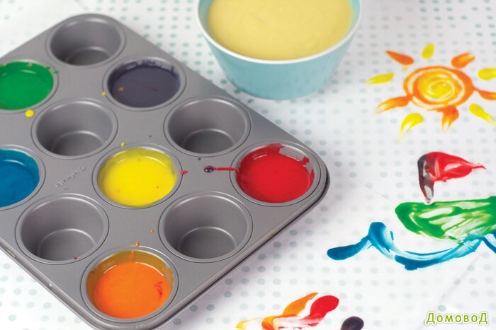 Сделать пальчиковые краски очень быстро и легко. А еще они безопасны и съедобны! Я до сих пор не нашла ребенка, который не любит пальчиковые краски. (Так же, как я до сих пор не нашла родителя, который любит уборку всего этого действа, так что извините заранее,.. это супер грязное дело, но оно того стоит!) Маленькие дети часто пытаются попробовать или съесть краски, с нашим рецептов Вы можете расслабиться и ни о чем не беспокоиться. Эти краски нетоксичны! Существует огромное количество разнообразных рецептов пальчиковых красок для детей, но этот самый простой и ленивый! С приготовлением съедобных красок справится даже папа ) Итак, нам понадобятся: - пакетик растворимого ванильного пудинга (100 гр) - 2 стакана холодной воды - пищевые красители разных цветов Приготовление: 1. Взбейте венчиком в миске пудинг с водой до однородной консистенции. 2. Разлейте полученную смесь по стаканчикам, баночкам (мы использовали форму для кексов) 3. В каждый стаканчик добавляете краситель и размешивае