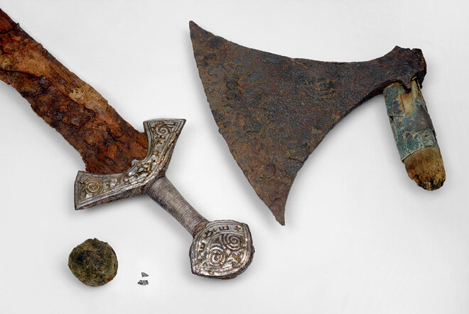 В 2011 году группа археологов обнаружила крупное захоронение поздней эпохи викингов (X-XI вв.) Несколько могил знатных воинов располагались неподалеку от небольшой деревни Лангейд, что в Южной Норвегии. Наиболее яркие находки покоились в могиле под номером 8. Интересно, что вокруг могилы имелись отверстия, каждое из которых держало столб. Похоже, сверху имелась некая надстройка - что-то вроде крыши на четырех столбах. Гроб под номером 8, вероятно, принадлежал очень влиятельному человеку. Об этом также свидетельствует оружие, найденное при раскопках. От самого гроба практически ничего не осталось, а вот по обеим его краям были размещены: богато украшенный меч викингов - с одной стороны, двуручная секира - с другой. Оружие прекрасно сохранилось и представляет собой крайне ценную и редкую находку. Кроме него, в могиле №8 нашли шар из смолы и фрагменты двух серебряных монеток, которые можно заметить на первом фото выше. Подписывайтесь на канал! и заглядывайте в телеграм - t.me/battlez