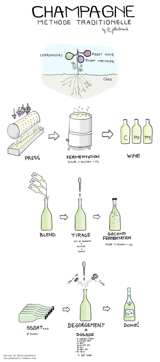 Игристое вино ассоциируется всегда с торжественным событием и обычно его наливают в специальные узкие бокалы, в котором мы можем наблюдать игру пузырьков, которые являются частью вкуса и текстуры вина и требуют особого внимания. Как делают шампанское ? Я говорю «Шампанское», потому что большинство людей называют так все игристое не зная что есть различные способы производства игристых винн. Существует 4 распространенных способа сделать игристое вино: Классический метод (ферментация в бутылке) (Méthode Champenoise, Metodo Classico, Méthode Traditionelle) Шампанского и Креман де Эльзас, во Франции, Franciacorta в Италии, Кава в Испании Дедовский или деревенский метод Сейчас этот предшественник шампанизации опять в моде (так делают Пет Наты) Метод не включает вторичное брожение, а вино бутилируют до завершения первичного спиртового брожения. Метод закрытого брожения или метод Шарма или резервуарный метод Используется для массового производства недорогих, но при этом высокого качества
