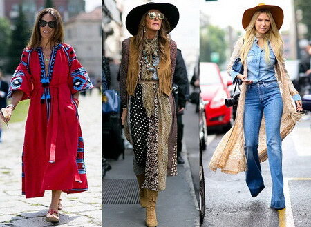 Одежда, которая стилизована под национальный костюм. Элементы национального костюма прослеживаются в крое, отделке или деталях наряда. Фасоны самые разнообразные. Вязаные изделия часто крупной и грубой вязки. Блузки фольклорного стиля с круглой горловиной и высокой застёжкой, рукав присборен, и иногда горловина стянута кулиской. Юбки многоярусные, очень свободные, украшен кружевом или вышивкой. Длина разная, но не мини. Брюки могут быть широкие, или зауженные к низу, шаровары, собранные на резинку в области лодыжки. Восточная одежда – шелк, жаккард. Славянская – лен, хлопок. Декор – бусины, бисер, тесьма, шнуровка, кант, шитье, атласные ленты, плетение. Пуговицы из дерева. Украшения из натуральных камней, из перьев, из дерева, из кожи. Повязки на голову, бусы, ремни. Сумки из кожи, из ткани, из замши или плетеные. Обувь: кожаные туфли на каблуках разной высоты, высокие сапоги, ботинки на шнуровке, сандалии и шлепанцы. Часто на деревянной подошве, с ремешками. Важный момент