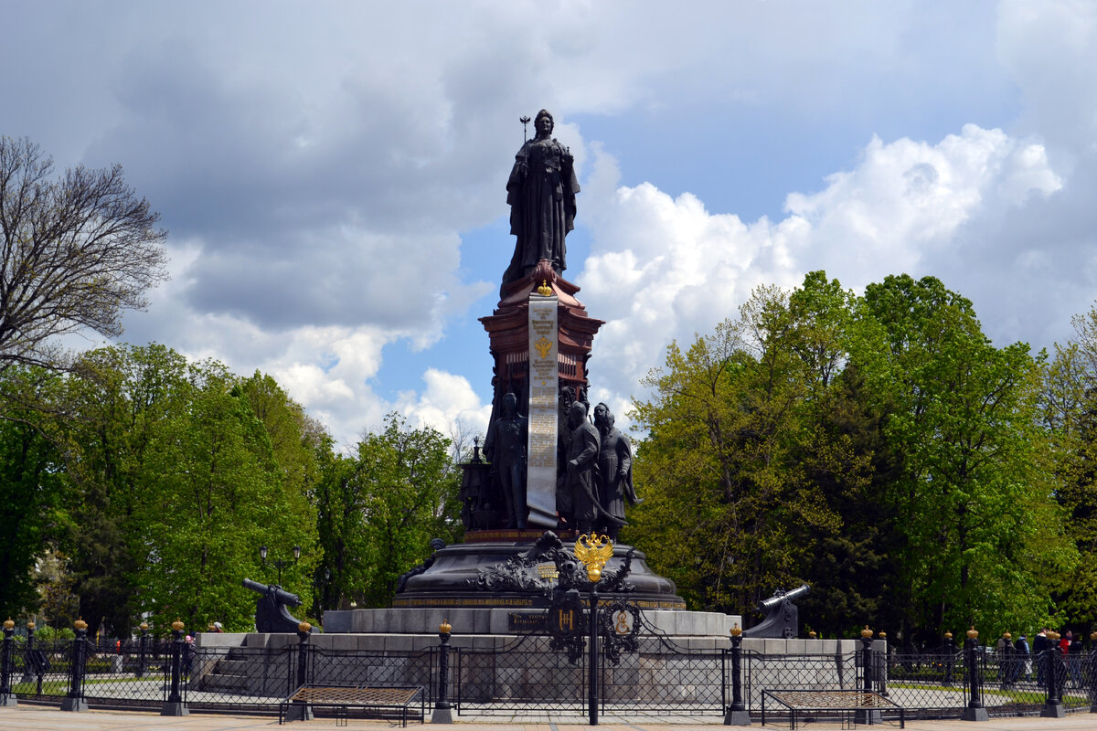 Краснодар. Город который построили казаки. И конечно же в этом городе достаточно архитектурных памятников которые приоткроют вам историю города и возможно после прибывания возле этих объектов вам захочется пойти в ближайшую библиотеку и дальше углубится в историю города. А самое приятное то, что эти памятники совсем не сложно найти, так как все они находятся на одной улице. 1. Первым делом конечно же стоит посетить памятник Екатерине II. Он находится в самом начале улицы Красной, в самом центре Екатерининского сквера. Строительство памятника было приурочено к столетию переселения на Кубань казаков Черноморского войска. В 1920 году по решению советской власти он был демонтирован, а в 1931 году сдан на переплавку. 8 сентября 2006 года в Краснодаре состоялась торжественная церемония открытия памятника. 2. Двигаясь дальше по улице Красной, на пересечении с улицей Горького вы встретите еще один памятник "Запорожские казаки пишут письмо Турецкому султану" 28 сентября 2008 года в Красно