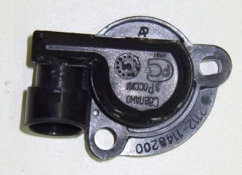 Датчик положения дроссельной заслонки Датчик положения дроссельной заслонки установлен на корпусе дроссельного патрубка и имеет механическую связь с осью дроссельной заслонки. Датчик представляет собой резистор потенциометрического типа, на один из выводов которого с контроллера подается опорное напряжение 5 В, а второй вывод соединен с "массой". Третий вывод соединяет подвижный контакт датчика с контроллером, что позволяет контроллеру на основе выходного сигнала с датчика определять положение дроссельной заслонки и с учетом данных других датчиков рассчитывать длительность импульсов на форсунку. При закрытом положении дроссельной заслонки выходной сигнал датчика должен быть в пределах от 0,3 до 0,7 В. При открытии дроссельной заслонки выходной сигнал возрастает, и при полностью открытом дросселе выходное напряжение должно быть выше 4 В. При резком нажатии на рычаг управления дроссельной заслонкой контроллер воспринимает быстро возрастающее напряжение сигнала с датчика, увеличивает