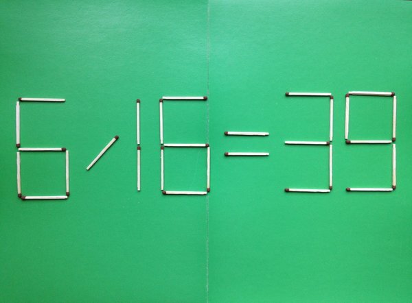 Задача: необходимо переложить четыре спички таким образом, чтобы в результате неверное равенство 6/16=39 стало верным.