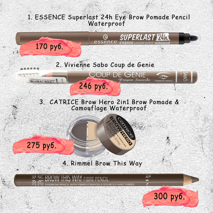 Красиво оформленные брови создают основу выразительного взгляда и вашего макияжа в целом. Самое главное найти хороший продукт который будет стойкий, удобный в нанесении, и не выдавать рыжину, что подчеркивает нарисованность бровей. 1. Если у вас не густые и выразительные брови то вам необходимо подчеркивать геометрию ваших бровей более плотными текстурами: карандашом или с помощью помады для бровей. 1. ESSENCE Superlast 24h Eye Brow Pomade Pencil Waterproof - помада для бровей с удобной кисточкой. 2. Vivienne Sabo Coup de Genie -карандаш для бровей средней твердости. 3. BCATRICE Brow Hero 2in1 Brow Pomade & Camouflage Waterproof - Помадка для бровей. 4. RIMMEL Brow This Way - карандаш для бровей средней твердости. 2. Для того чтобы брови выглядели более натуральными, необходимо растушевать контуры и заполнить внутреннюю часть ваших бровей. Это можно сделать как просто кисточкой так и с помощью теней для бровей. 1. VIVIENNE SABO Brow Arcade - Тени для бровей. 2. CATRICE Eye Brow