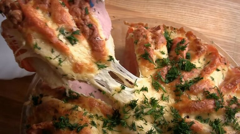 Предлагаю вам ленивый вариант вкусной сытной выпечки: оригинальный пирог из батона с ветчиной и сыром. Закуска в яичной заливке получается невероятно ароматной, аппетитной: каждый кусочек буквально тает во рту. Пирог очень удобно подавать в порционном виде: даже резать не придется. Возьмите выпечку с собой на природу: для быстрого перекуса. Готовится закуска очень быстро, а исчезает со стола еще быстрее: всего за пару минут. Необходимые ингредиенты: Оригинальный пирог из батона с ветчиной и сыром: пошаговый процесс приготовления Оригинальный пирог с ветчиной и помидорами готов, когда схватится омлет и подрумянится сыр. Подаем его на стол, посыпав свежей зеленью: любой, на ваш вкус. Такой пирог станет отличным вариантом перекуса для тех, кто собирается на пикник. Он может конкурировать даже с шашлыком: настолько вкусным и оригинальным получается. Другие простые рецепты интересных блюд смотрите на нашем сайте «Девчата». Приятного вам аппетита и отличного настроения.
