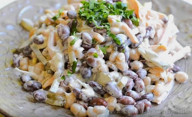 - 3 столовые ложки майонеза (можно воспользоваться рецептом майонеза и заправок, которые представлены на моем канале, помните, все эти рецепты реальные). Берем большую миску, открываем каждую банку и сливаем лишнюю воду. Огурец вымыть и разрезать кубикам. Ветчину убрать лишнее и порезать тоже кубиками. Все выкладываем в одну миску и добавляем сухарики. Все наше наслаждение заправляем майонезом и наслаждаемся наивкуснейшим салатом.
