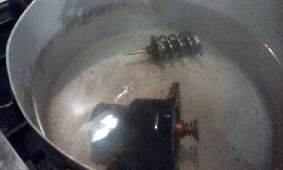 Здравствуйте, уважаемые читатели! Поделюсь своим скромным опытом по проверке работы термостата. И так, стал барахлить термостат: температура ОЖ сначала была 80 градусов и не поднималась выше, а позднее термоэлемент заклинил в закрытом состоянии и температура была близка к перегреву. Для замены я приобрел новый термостат в сборе и решил проверить термоэлемент на работоспособность: термометра под рукой не было, но я воспользовался кастрюлей с водой, которую я поставил на газовую плиту. Старый термоэлемент, предварительно демонтированный с неисправного термостата был также опущен в воду. После нагрева стало видно, что шток неисправного термоэлемента практически не сдвинулся с места, чего не скажешь о новом. Процесс замены термостата я опишу в отдельной статье чуть позже, а пока перечислю симптомы, которые могут говорить о неисправности термостата: - Двигатель не прогревается до рабочей температуры (88-92 градуса)-термостат заклинил на большом круге. -Двигатель очень быстро прогревается до