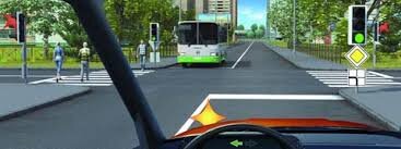 Ситуация проста до безобразия: у нас горит зеленый сигнал светофора, надо повернуть налево. По встречной полосе едет автобус. Поворотники у него не горят, поэтому думаем, что ехать он будет прямо. Но ситуация осложняется наличием пешеходного перехода на примыкающей улице и знаков приоритета… (см. картинку) Знак «главная дорога» как раз говорит нам, что при повороте налево у нас есть приоритет перед транспортными средствами, которые едут во встречном направлении. Но знаки работают только тогда, когда нет светофора. Следовательно, на знаки не обращаем в данном случае никакого внимания. У нас горит зеленый, и у автобуса тоже горит зеленый. Мы поворачиваем, значит нам надо его пропустить. У пешеходов, переходящих примыкающую улицу, также горит зеленый, да еще и нарисован пешеходный переход, поэтому их тоже придется пропускать. Итак, в этой ситуации мы должны пропустить всех: и автобус, и пешеходов. Только после этого можем завершить поворот налево, несмотря на разрешающий сигнал светоф