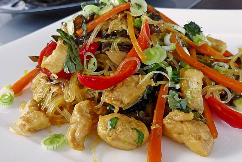 Этот салат подойдет для худеющих как на ужин так и на обед. Можно кушать его как самостоятельное блюдо, так и с гарниром. Также его можно подать на праздничный стол. Сама лапша очень полезна, делается она из крахмала, бобовый крупы МАШ. Для приготовления Вам понадобится: 1 пачка лапшы фунчоза 1 красный болгарский перец 250-300 грамм куриного филе 150 грамм корейской моркови зеленый лук и любимая зелень приправа для фунцозы 1-2 свежих огурца Способ приготовления: 1. Моем куриное филе и нарезаем не большими кубиками, обжариваем его на сковороде до золотистой корочки (желательно обжариваем без масла) 2. Моем и нарезаем болгарский перец соломкой 3. Берем глубокую миску, кладем в нее лапшу и заливаем крутым кипятком. Оставляем в воде на 5-7 минут и сливаем воду. Разрезаем лапшу ножницами, чтоб она была не сильно длинная и хорошо можно было перемешивать в салате 4. Нарезаем свежий огурец соломкой и отправляем в салатницу 5. Смешиваем ингредиенты и добавляем корейскую морковь, все очень хоро