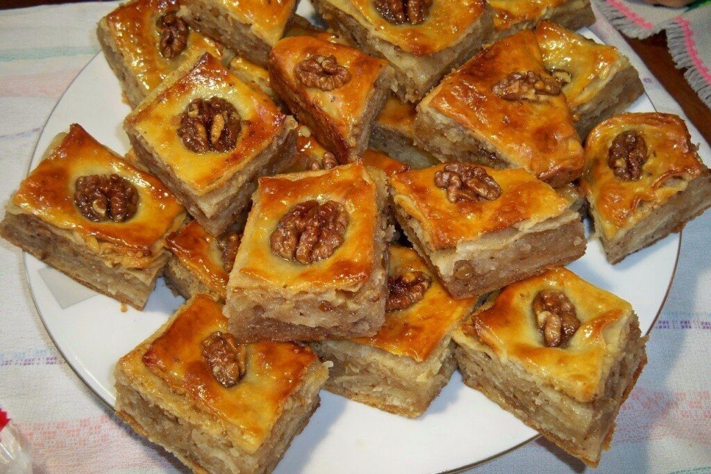 Пахлава – восточная слоёная сладость с орехами, мёдом, сухофруктами, сиропом, сахаром. Немного истории Есть две версии её появления. В кулинарной книге времён правления султана Мехмеда Завоевателя есть запись о том, как готовить пахлаву. Правителю она очень понравилась, и он приказал готовить её во все праздничные дни. Второй вариант указывает на более древнее происхождение – восьмой век до нашей эры. Изобрели её на территории сегодняшней Турции, а греческие купцы привезли пахлаву в свою столицу. Греки способствовали улучшению рецепта – смогли раскатать тонкий лист теста, как бумага. Жители Анатолии же готовили блюдо из толстого теста, похожего на хлеб. Эти разногласия привели к множеству конфликтов. Каждое государство считало пахлаву своим национальным блюдом. Рецепт Чтобы приготовить этот восточный десерт, понадобится два с половиной стакана сахара, столько же сливочного масла. Также нужен большой стакан сметаны и четыре стакана муки. Ещё нужно четыре куриных яйца, два стакана гр