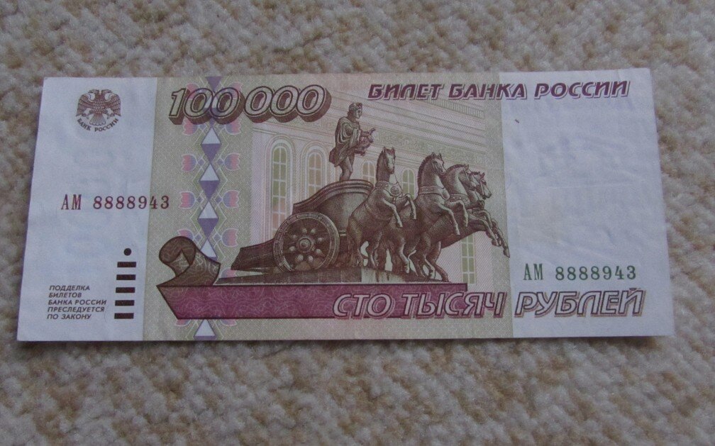 Еще с тех самых "лихих 90-х" хранится у меня купюра номиналом в 100000 рублей. Это было время, когда коммерсанты превратились в бандитов, а бандиты стали занимать важные чины в управлении государством. Это было время, когда можно было не платить зарплату, а за это ничего никому не было. Это было время, когда сегодняшние олигархи за счет жизней обычных людей делали свое состояние. Короче, одна из самых позорных страничек в истории нашей страны. Бравые экономисты довели страну до той степени разрухи, которая была после Гражданской войны. В обращении вновь появились миллионы - как верный признак полнейшей разрухи. В то время сумма в 1000000 рублей была довольно не маленькая. На них можно было купить 25 булок хлеба. С учетом того, что основная часть страны жила за чертой бедности, мало кто мог позволить оставить эту бумажку "на будущее". Сегодня она представляет интерес лишь для коллекционеров. Спрос на них небольшой, но он имеется. В среднем подобные купюры продают по цене от 500 до