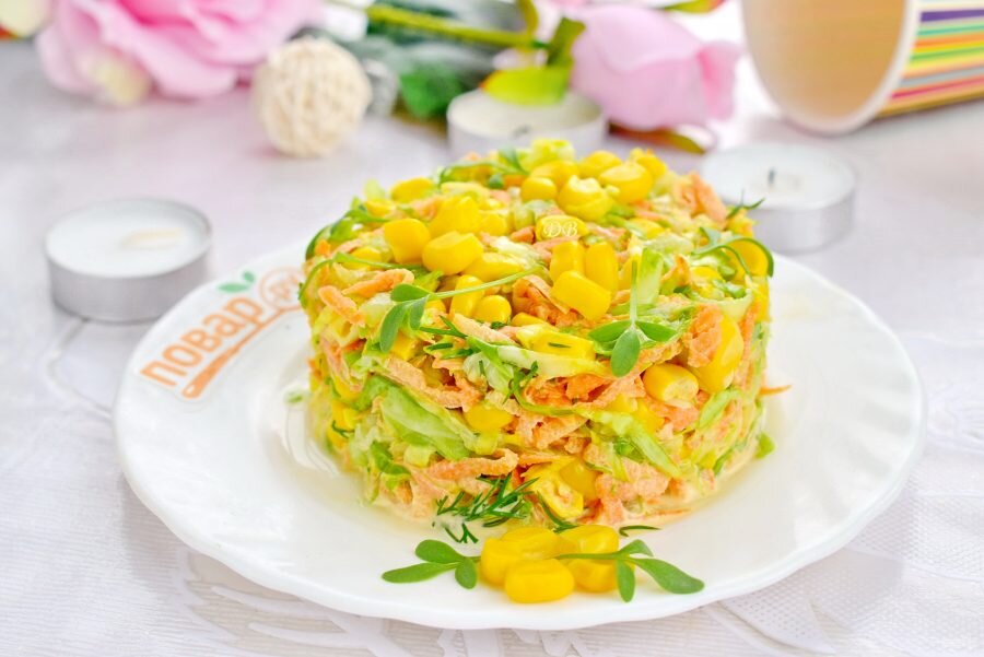 В глубокой миске смешайте мелко нашинкованную капусту, тертую морковь, огурец, свежую зелень, консервированную кукурузу. Заправьте салат майонезом с чесноком (или оливковым маслом с чесноком и измельченной зеленью). Переложите салат на сервировочное блюдо, украсьте зернами консервированной кукурузы и свежей зеленью.