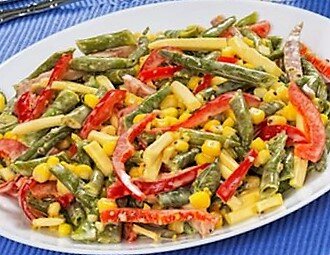 Когда что-то хочется на ужин низкокалорийного, и не знаешь что приготовить, тогда попробуй этот замечательный рецепт. Очень вкусный и полезный салатик! Для приготовления Вам понадобится: 300-400 грамм замороженной стручковой фасоли 2 яйца 1 красный болгарский перец 1 баночка консервированной кукурузы 1 зубчик чеснока греческий йогурт или 15% сметана соль перец Способ приготовления: 1. Берем сковороду, разогреваем и засыпаем стручковую фасоль. Наливаем пол стакана воды и тушим минут 6-8, пока вода не выкипит 2. После того как фасоль приготовится, убираем ее со сковороды и в туже сковороду наливаем 1 ложку оливкового масла, и 1 зубчик мелко нарезанного чеснока 3. Обжариваем чеснок до готовности и перекладываем в сковороду с чесноком стручковую фасоль, солим и перчим по вкусу. Разбиваем 1 яйцо и хорошенько все мешаем до готовности 4. Перекладываем, нашу готовую стручковую фасоль с яйцами и чесноком, в салатницу 5. Открываем банку кукурузы, сливаем жидкость и пересыпаем кукурузу в салатн