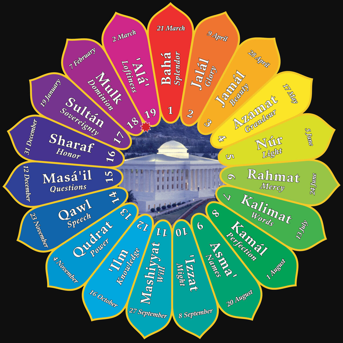 Календарь бахаи (его еще называют календарь бади) введен Бабом. Эра Бахаи ведет отсчет с года Возвещения Баба (1844 год по григорианскому календарю). Особенности календаря Год солнечный и состоит из 19 месяцев по 19 дней (361 день). Для согласования календаря с солнечным годом между восемнадцатым и девятнадцатым месяцами добавлено несколько Вставных дней. Празднование Навруза – Нового года бахаи – привязано к астрономическому событию. Новый год начинается в момент наступления весеннего равноденствия, когда солнце входит в созвездие Овна. Всемирный Дом Справедливости постановил, что Тегеран, родина Бахауллы, должен быть тем местом на земле, которое будет служить в качестве стандарта для определения момента весеннего равноденствия в Северном полушарии. Согласование дат календаря бахаи с другими календарями будет смещаться в зависимости от наступления Навруза.В календаре бахаи существует разделение на следующие месяцы: Начало каждого месяца отмечается в общине как Праздник Девятнадцатого