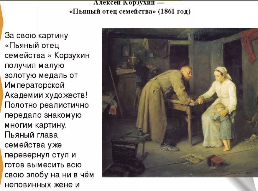 В процесс воспитания были вовлечены отцы и как правило не всегда трезвые. Алексей Корзухин "Пьяный отец семейства" 1861 г. Художник был однин из первых, кто поднял злободневную тема в искусстве. В середине XIX века, когда бесправие женщин и детей на силу ужасающего масштабы. Такие сцены были обыденными во многих Российских Семьях. Художник Репин говорил о зарождении нового направления в жанровой живописи. Картины той эпохи заставляли зрителя краснеть, содрогаться и построже вглядываться в себя. Не угодно ли любоватся- Картина Корзухина. Пьяный отец вваливается в свою семью В бесчувственном состоянии. Жена и дети в паническом ужасе- до чего одичал этот варвар. Иван Горохов Картина “Запил” конец XIX века. Захмелевший крестьянин переступив порог дома С бутылкой водки Привёл домочадцев в отчаяние. Ну что могут сделать Женщина и десятилетний мальчик, В гневе сжимающие кулачки? В деревне моей бабушки Соболевка на Могилевщине шестнадцатилетние близнецы- мальчики зарубили отцу пьяниц