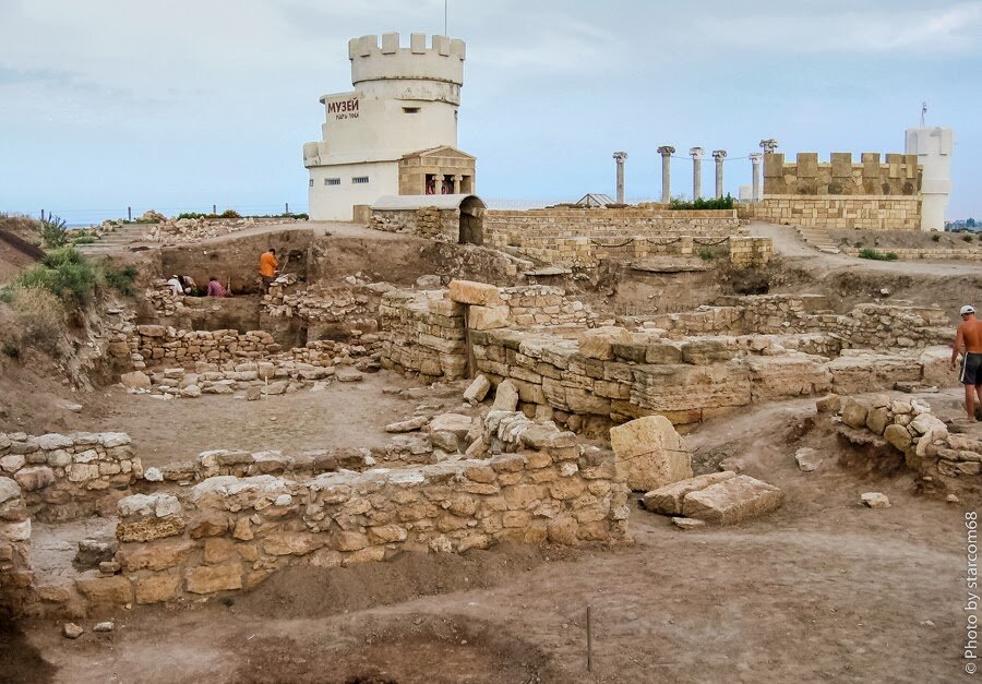 Если ехать в Евпаторию по автомобильной дороге со стороны Севастополя, то после своротка на Саки по правую руку бросается в глаза возвышающийся над степью холм с причудливыми постройками. Это городище Кара-Тобе, что в переводе с тюркского означает «Черный холм». Более 5 тысяч лет назад у западного склона этого холма плескалось Черное море, но первое поселение греческих колонистов возникло только в IV веке до нашей эры. На городище я побывал дважды, в 2005 году и сейчас. Фотографиями раскопок особо не заморачивался, ибо мое внимание привлекали более поздние артефакты.