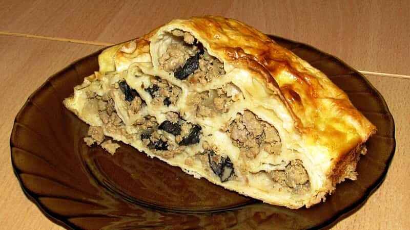 Дорогие хозяюшки, многим из Вас знаком рецепт торта, который принято считать новогодним под названием «Монастырская изба», или же «Зимняя вишня». В этой статье я поделюсь с Вами рецептом, как готовя тот же торт, но с другими ингредиентами, получить вкуснейший, ароматный и сочный пирог, который обязательно придется по вкусу Вам и Вашим близким. Для приготовления нам потребуются следующие ингредиенты: 500 – 700 г фарша, 250 – 300 г грибов (свежих шампиньонов), 4 куриные яйца, 22 листочка готового теста (если берем слоеное тесто, то при готовке, хорошенько его раскатываем), 2 крупных луковицы, 2 ст. л. растительного масла, специи (любые, на ваше усмотрение), перец и соль по вкусу. Для начала, ставим на плиту сковороду, выливаем в нее растительное масло, и на среднем огне, до готовности обжариваем мелко нашинкованный лук. Сюда же добавляем фарш, перемешиваем, готовим 5 минут. В это время промываем грибы, очищаем, мелко нарезаем и так же отправляем в сковороду. Солим, пе