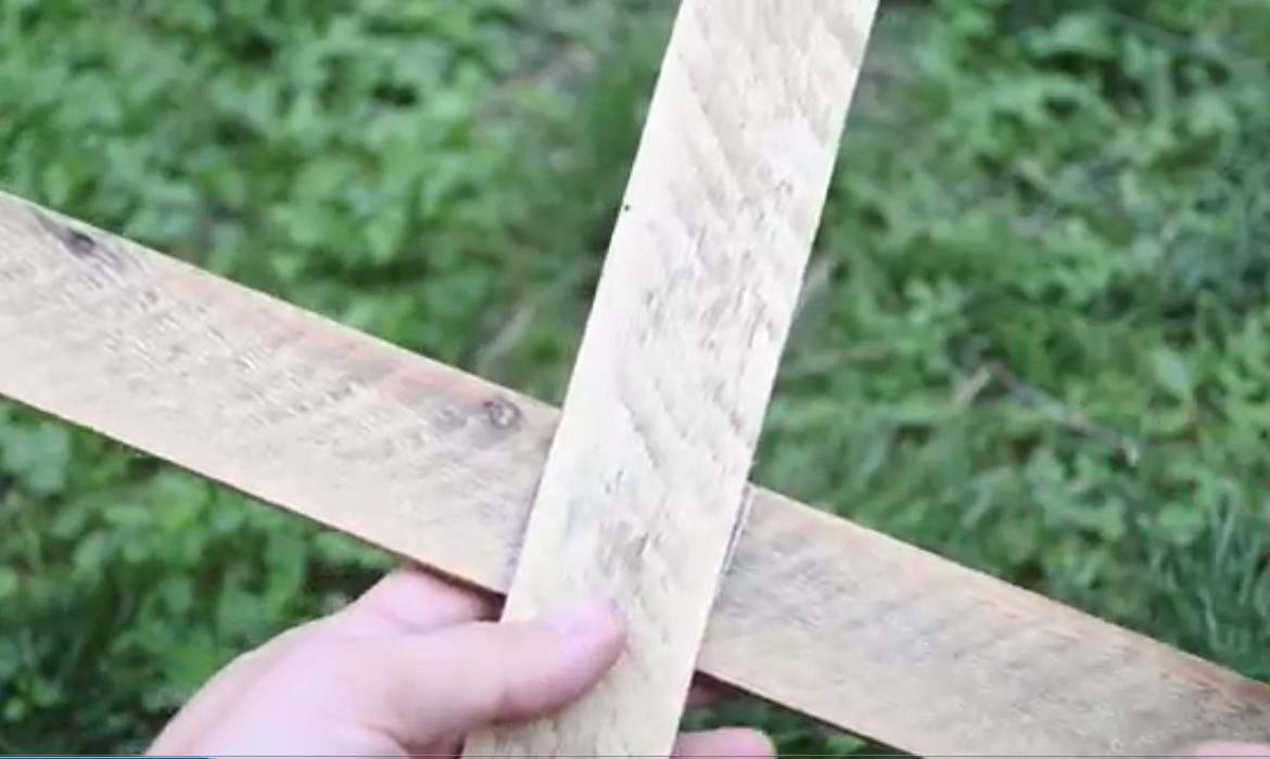 Понадобятся две дощечки длиной около тридцати сантиметров можно чуть длиннее, шириной четыре сантиметра и толщиной около семи миллиметров, а также 10 минут нехитрой работы ножовкой и наждачкой. Чем тяжелее дерево тем и лучше будет лететь бумеранг, нельзя использовать полностью сухую сосну она слишком легкая. Эти дощечки из довольно тяжелой смолистой сосны, такие вполне подходят они будут крепиться крест-накрест и очень важно их расположение в одной плоскости, для этого нужно будет сделать пазы. Размечаются они ровно в центре ширина пазов равна ширине дощечки, а толщина половине ее толщины, при помощи ножовки делаются две прорези наполовину толщины дощечки далее аккуратно ножом выламывается центральный кусочек, они должны идеально входить друг в друга и образовывать цельную деталь без выступов, если что следует подкорректировать по стороне напильником. Теперь каждой из четырех лопастей нужно придать форму самолетного крыла, то есть профиль каждой лопасти должен быть как на картинке. Ч