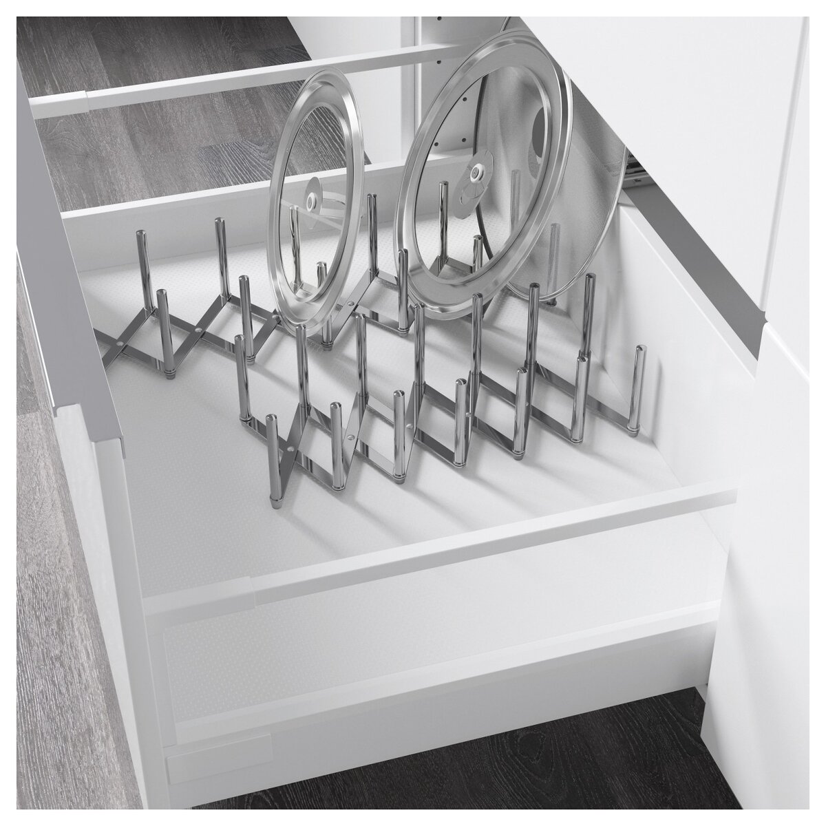 Сегодня поделюсь с вами самыми удобными способами хранения крышек. Если вы только планируете кухню, обязательно прочитайте данную статью и заранее продумайте, где вы будете хранить не только посуду для готовки, но и крышки для неё. Для них обязательно должно быть выделено отдельное место. 1. Отличный вариант предлагает ИКЕА. Подставка для крышек Варьера. Регулируется по длине, и это один из самых часто встречаемых мной способов хранения крышек. 2. Ещё одна идея, предусмотреть отдельный ящик для крышек, удобнее всего, если он будет находиться непосредственно над самими кастрюлями и сковородками, как в примере ниже. 3. Есть специальные подвесные подставки для крышек, их можно повесить просто на стену, а можно на дверцу шкафчика. Но в таком случае нужно быть уверенным, что дверца не просядет и не отвалится. Потому что нагрузка на неё будет большая. Лучше купить усиленные петли и периодически их подтягивать. 4. На Алиэкспресс тоже есть неплохой вариант для хранения. Такую подставку можно и