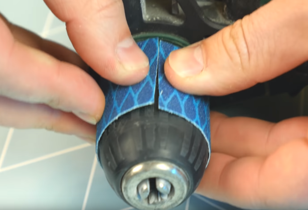 Первый лайфхак! Берем кусок наждачной бумаги и режем небольшую полоску. Теперь берем дрель и примеряем бумагу как показано на фото.
