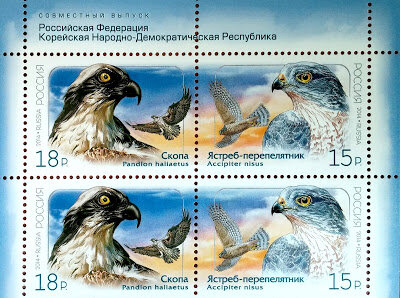 Совместный выпуск Российской Федерации и Корейской Народно-Демократической Республики. (Joint issue of the Russian Federation and the Democratic People's Republic of Korea.) Скопа и Ястреб-перепелятник. (Osprey and Sparrowhawk.)