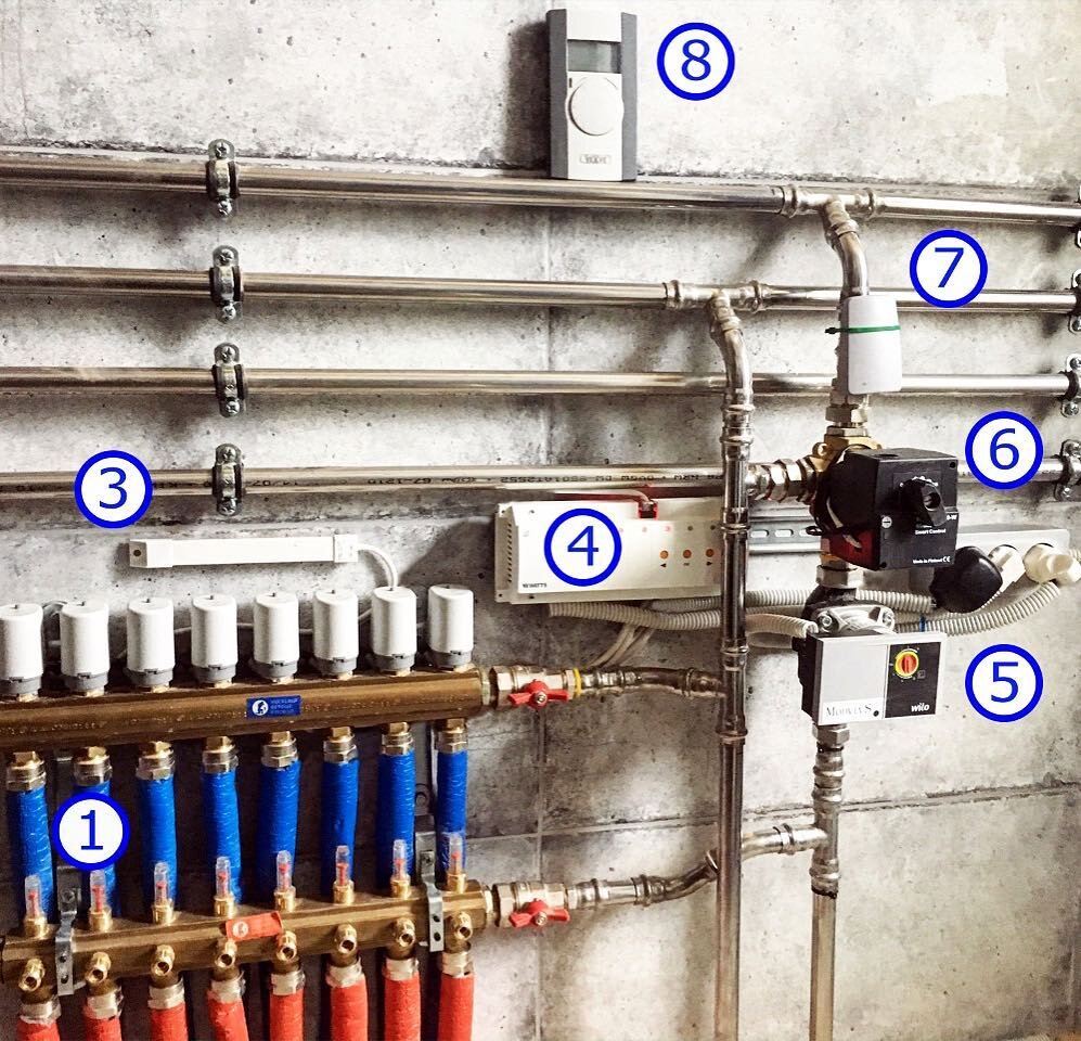 Один из множества вариантов автоматизации "теплого пола". В данном примере управление температурой по комнатам осуществляется беспроводными термостатами, в сторону снижения от основной. Основная регулируется трехпозиционным приводом с встроенной автоматикой.