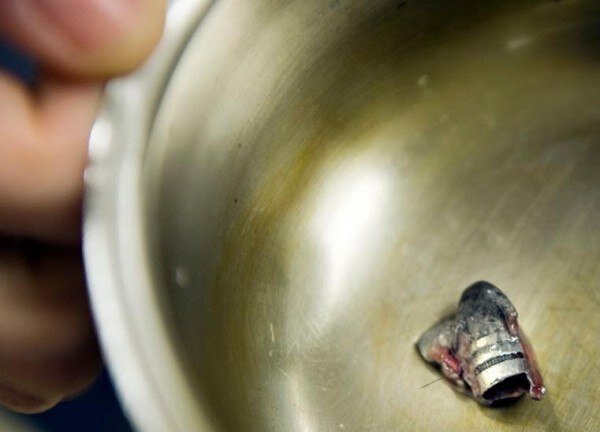 Наконец, раневой канал – это совсем не аккуратная круглая дырочка с застрявшей в его «слепом» конце пулькой. Это дыра с рваными краями, начиненная кровавым фаршем, с осколками костей внутри, с какими-то беленькими и синенькими жилками, с постоянно текущей оттуда кровью и еще чем-то непонятным… Зрелище не для слабонервных. Найти среди всего этого месива кусочек металла размером с ноготь – задача не из легких.