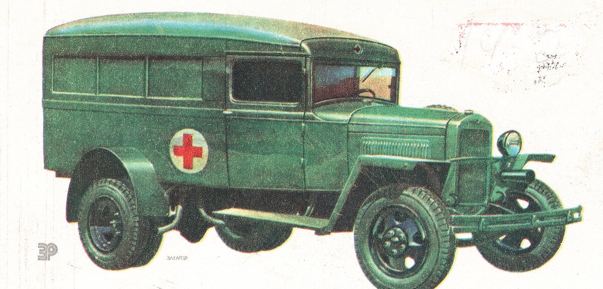 Медицинский автомобиль на шасси грузовика ГАЗ-ММ . В соответствии с назначением он был снабжен более мягкими рессорами и гидравлическими амортизаторами в задней подвеске, а также системой вентиляции и отопления (калорифер) салона. В годы войны машина широко использовалась для перевозки раненых, ГАЗ— 55 мог перевозить четырех человек на носилках, в том числе и подвесных, и двоих на откидных сиденьях или,соответственно, двух и пятерых человек (не считая санитара и водителя, На рисунке — автомобиль выпуска 1942—1945 гг. в общей сложности было изготовлено 9 130 машин этой модели. Годы выпуска — 1938-1945, колесная формула — 4Х2, число мест — 6-7; двигатель: число цилиндров - 4, рабочий объем — 3285 см, мощность — 50 л. с. при 2800 об/мин; число передач — 4; размер шин — 6,50-20; длина — 5425 мм; ширина — 2040 мм, высота — 2340 мм, база — 3340 мм; дорожный просвет — 200 мм, масса в снаряженном состоянии - 2370 кг, скорость — 70 км/ч.