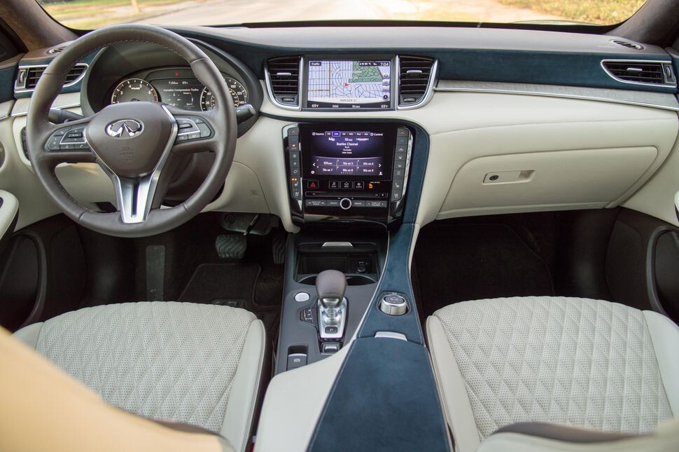 Еще одной нетипичной особенностью QX50 является двухъярусная информационно-развлекательная система. На верхнем экране работают функции навигации и резервного копирования, а графика, похоже, была вырезана из Garmin, установленного в Civic 1995 года. Нижний экран, который охватывает климат-контроль и почти все остальное, имеет четкий вид, который резко контрастирует с верхним экраном, что делает все это похоже на беспорядочный беспорядок. Apple CarPlay и Android Auto пропали без вести, что не улучшает ситуацию. Система Infiniti заслуживает похвалы за то, что у нее есть как сенсорные, так и циферблатные элементы управления, хотя - разные штрихи для разных людей.