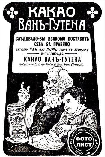 В 1910 г. произошел один из первых случаев общественной рекламы какао. Преступник, приговоренный к смертной казни, выкрикнул стоя на эшафоте в толпу: «Покупайте какао Ван Гуттена!» Сделал он это в обмен на солидную сумму от производителя какао для наследников. Буквально на следующий день, Ван Гуттен стал одним из самых известных людей, его имя печаталось во всех газетах, а какао моментально раскупалось с прилавков. Это факт советскому читателю знаком по стихотворению В.В. Маяковского "Облако в штанах": Хорошо, когда брошенный в зубы эшафоту, крикнуть: "Пейте какао Ван-Гутена!"