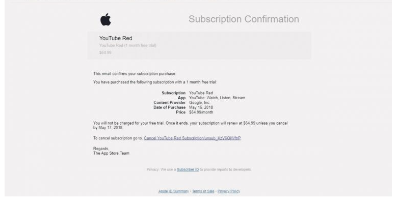 Цель данного письма подтвердить подписку на YouTube Red за $64,99. Для отмены просят перейти по ссылкам. Будьте бдительны и не попадитесь на эту уловку.