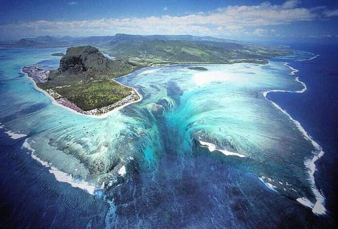 На первый взгляд может показаться, что у побережья тропического острова в Индийском океане открылся водоворот, но на самом деле это оптическая иллюзия, создаваемая отложениями ила и песка на морском дне.