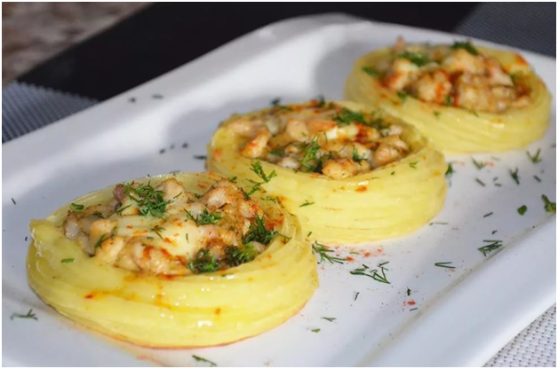 Процесс приготовления блюда у Вас займёт 25-30 минут. Для приготовления нам понадобятся следующие ингредиенты: Картофель (500 гр), сливочное масло (30 гр), желток (1 шт), зелень (1-2 ч.л), соль, перец, приправы ( по вкусу), куриный фарш (300 гр), твердый сыр (120-150 гр), лук (1 шт). Процесс приготовления: 1. Моем, чистим и отвариваем картофель 2. Трем на крупной терке сыр: 3. Картофель разминаем в пюре, добавляем сливочное масло, желток, сыр (50 гр), зелень и все хорошенько перемешиваем: 4. Лук нарезаем мелко: 5. В фарш добавляем приправу, лук, сыр (100 гр) и все перемешиваем: 6. Форму для выпечки смазываем сливочным маслом: 7. Из пюре делаем шарики и выкладываем в форму. Для того чтобы к рукам картофель не прилипал, смачиваем руки холодной водой. 8. Берем стакан, смачиваем дно стакана в холодной воде и делаем отверстия (должно получиться гнездо) в картофельных шариках. 9. Берем столовую ложку фарша, формируем шарик и кладем в отверстие картофельного пюре 10. В разогретую духовку