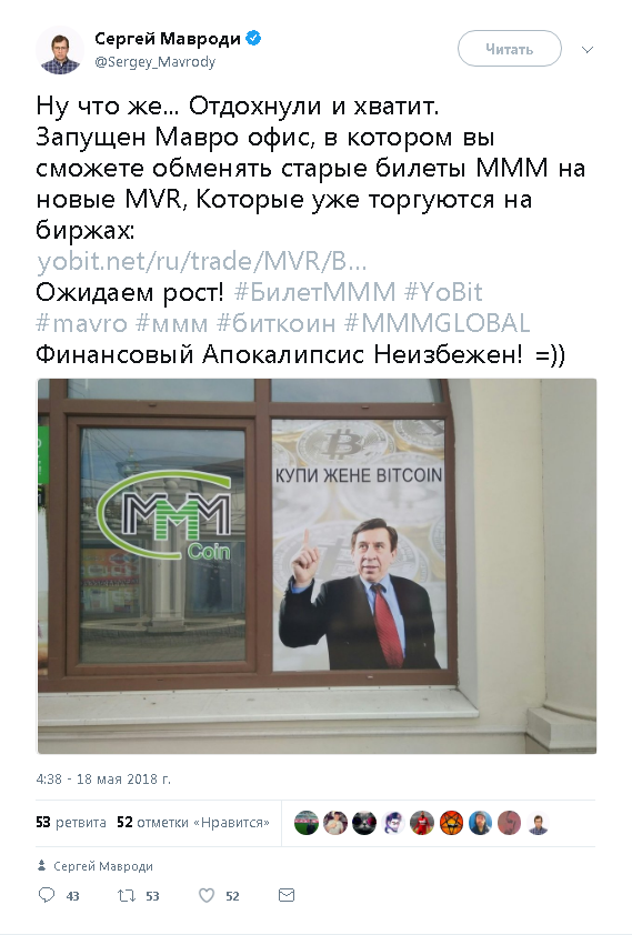 Twitter-аккаунт основателя "МММ" Сергея Мавроди возобновил активность после смерти своего хозяина. 18 мая в нем появилось первое сообщение об открытии нового Мавро-офиса.. " Ну что же... Отдохнули и хватит. Запущен Мавро офис, в котором вы сможете обменять старые билеты МММ на новые MVR, Которые уже торгуются на биржах: ...... Ожидаем рост! #БилетМММ #YoBit #mavro #ммм #биткоин #MMMGLOBAL Финансовый Апокалипсис Неизбежен! =)) " Сатана как лучшему другу дал пароль от Wi-Fi ада. "- пишут пользователи," Откупился от ада или переместил своё сознание в информпространство "